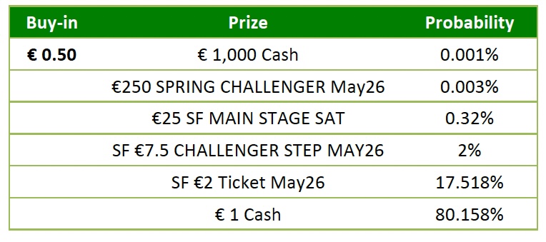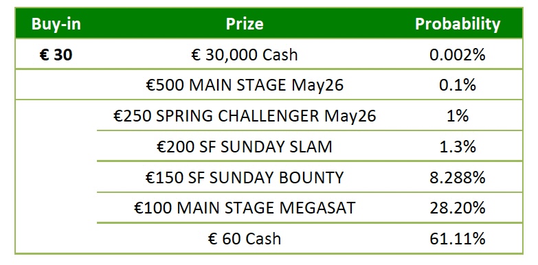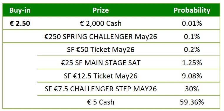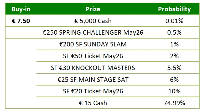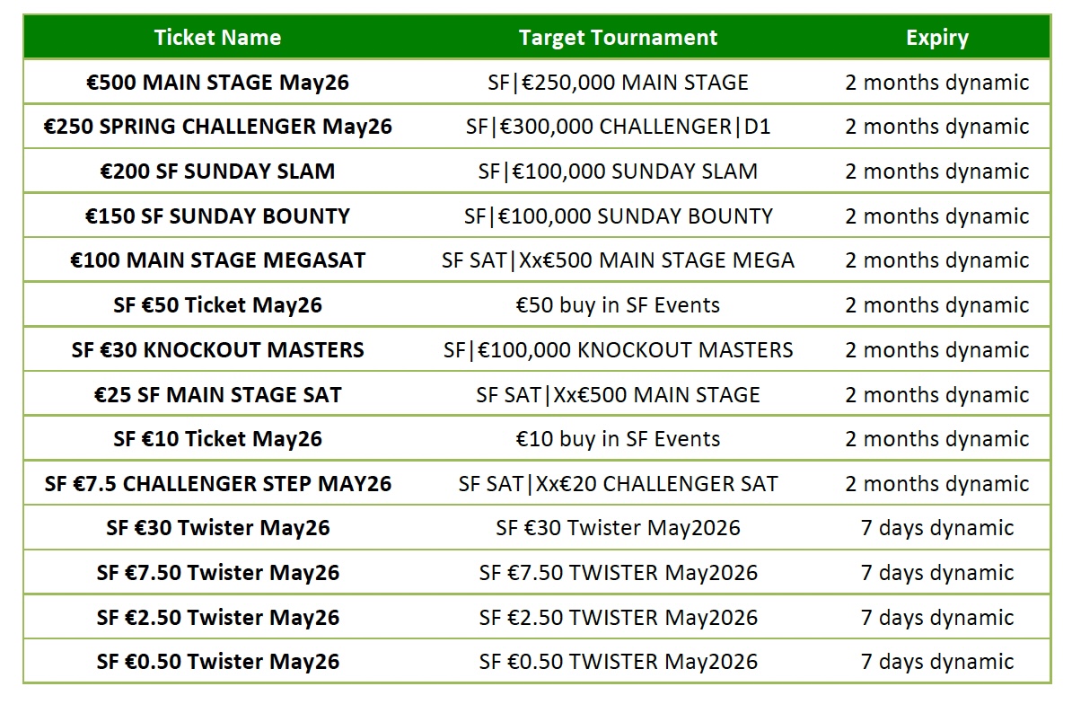 - “€500 MAIN STAGE May26”, “€250 SPRING CHALLENGER May26”, “€200 SF SUNDAY SLAM”, “€150 SF SUNDAY BOUNTY”, “€100 MAIN STAGE MEGASAT”, “SF €50 Ticket May26”, “SF €30 KNOCKOUT MASTERS“, €25 SF MAIN STAGE SAT”, “SF €10 Ticket May26” and “SF €7.5 CHALLENGER STEP MAY26” entry tickets are valid only in “SF” Spring Festival tournaments during the Promotion Period and expire 2 months after having been issued. After the Promotion Period they will be linked to all tournaments.